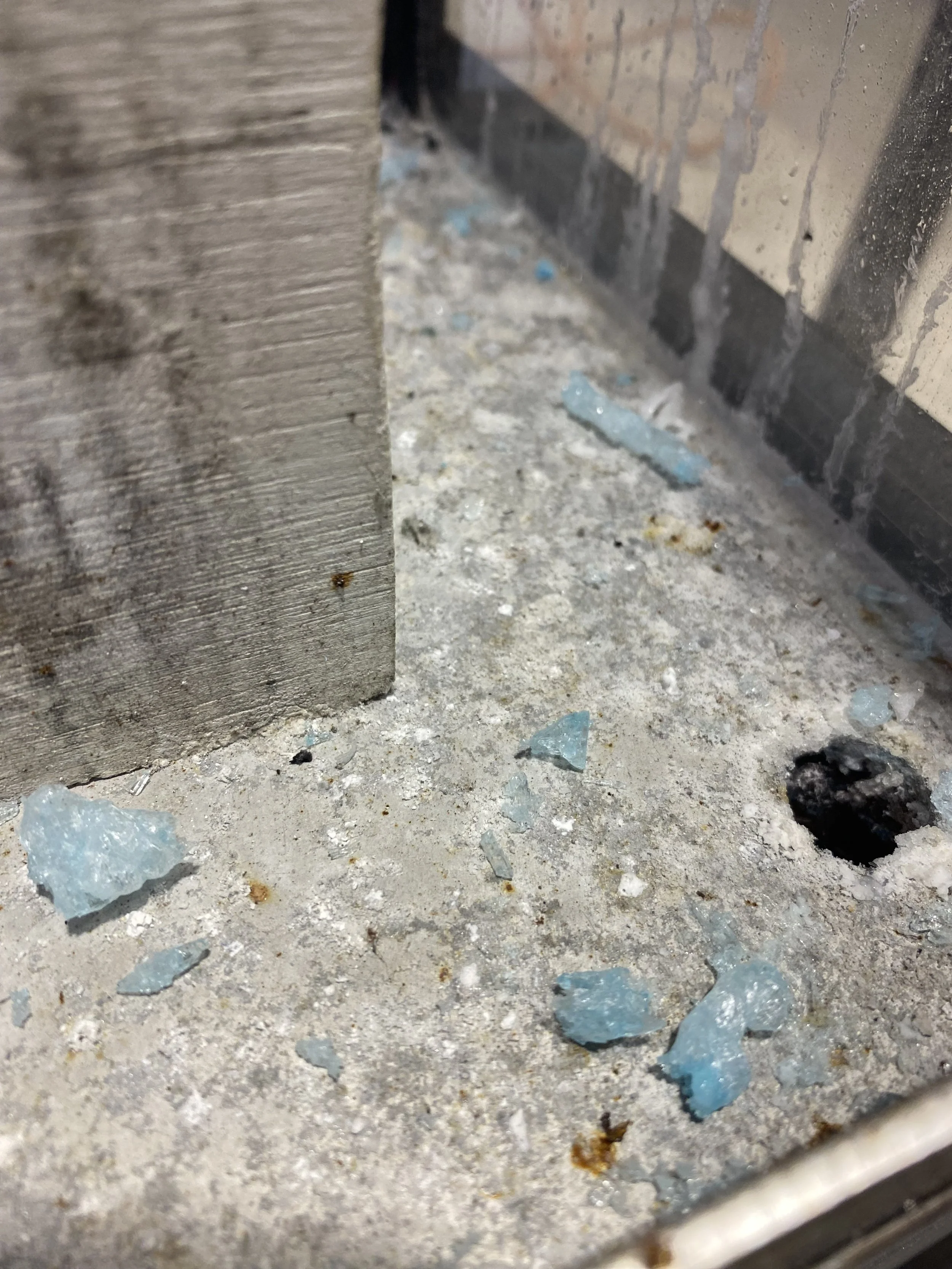 Under identical conditions, materials respond unevenly. Wax remains structurally stable while accumulating surface residue. Plaster undergoes localised erosion alongside areas of salt accretion. Bone retains its form, registering exposure primarily through microcrystalline growth. Salt and water residue also accumulate on the interior glass surfaces of the vitrine, partially obscuring visibility and introducing mediated perception as part of the work’s operation.