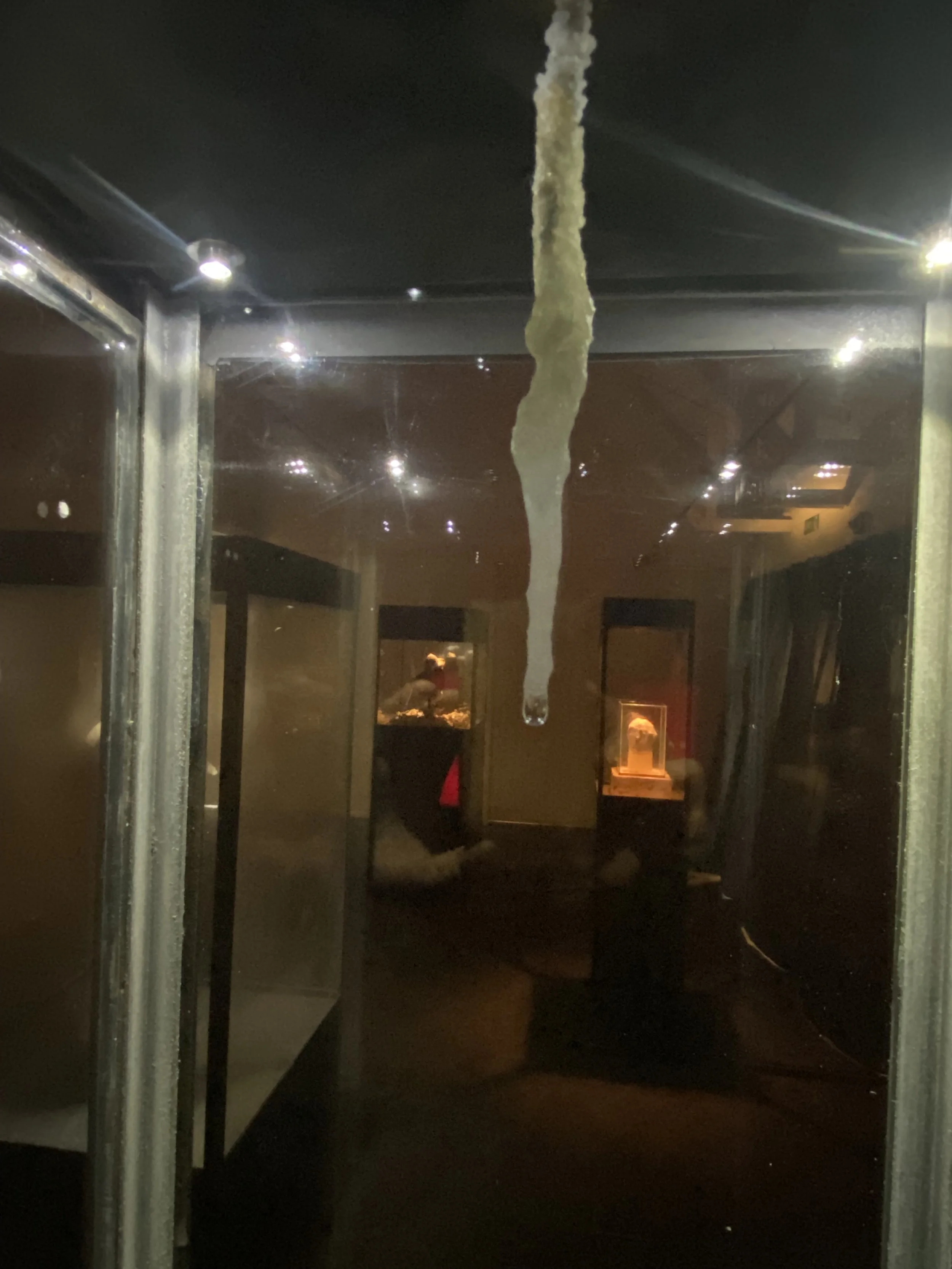 The solution is delivered through a plaited cotton rope that functions as a regulating element within the system. As salt accumulates along the fibres, crystalline growth alters both the rope’s length and permeability. Ambient temperature directly influences this process. In warmer conditions, crystalline structures shorten and fracture, shedding residue that falls to the base of the vitrine. In cooler conditions, crystalline growth extends, increasing the rope’s length.