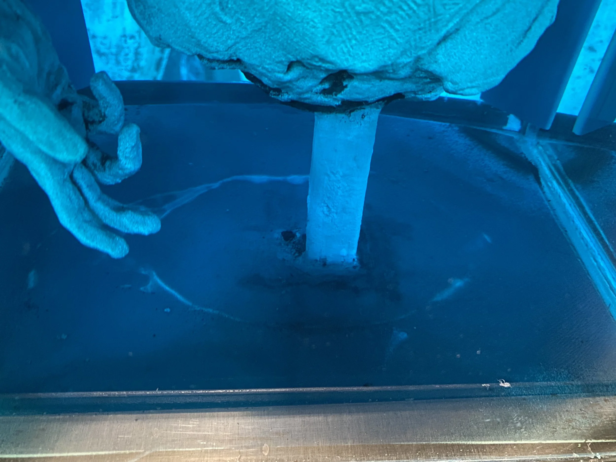 Secondary effects are integral to the work’s operation. Copper residue settles at the base of the vitrine and partially echoes the contours of the submerged sculpture. Prolonged chemical exposure also affects the vitrine itself, extending the process beyond the sculptural form. Through these combined conditions, time operates as an active material force, shaping form, visibility, and containment through sustained exposure and gradual transformation.