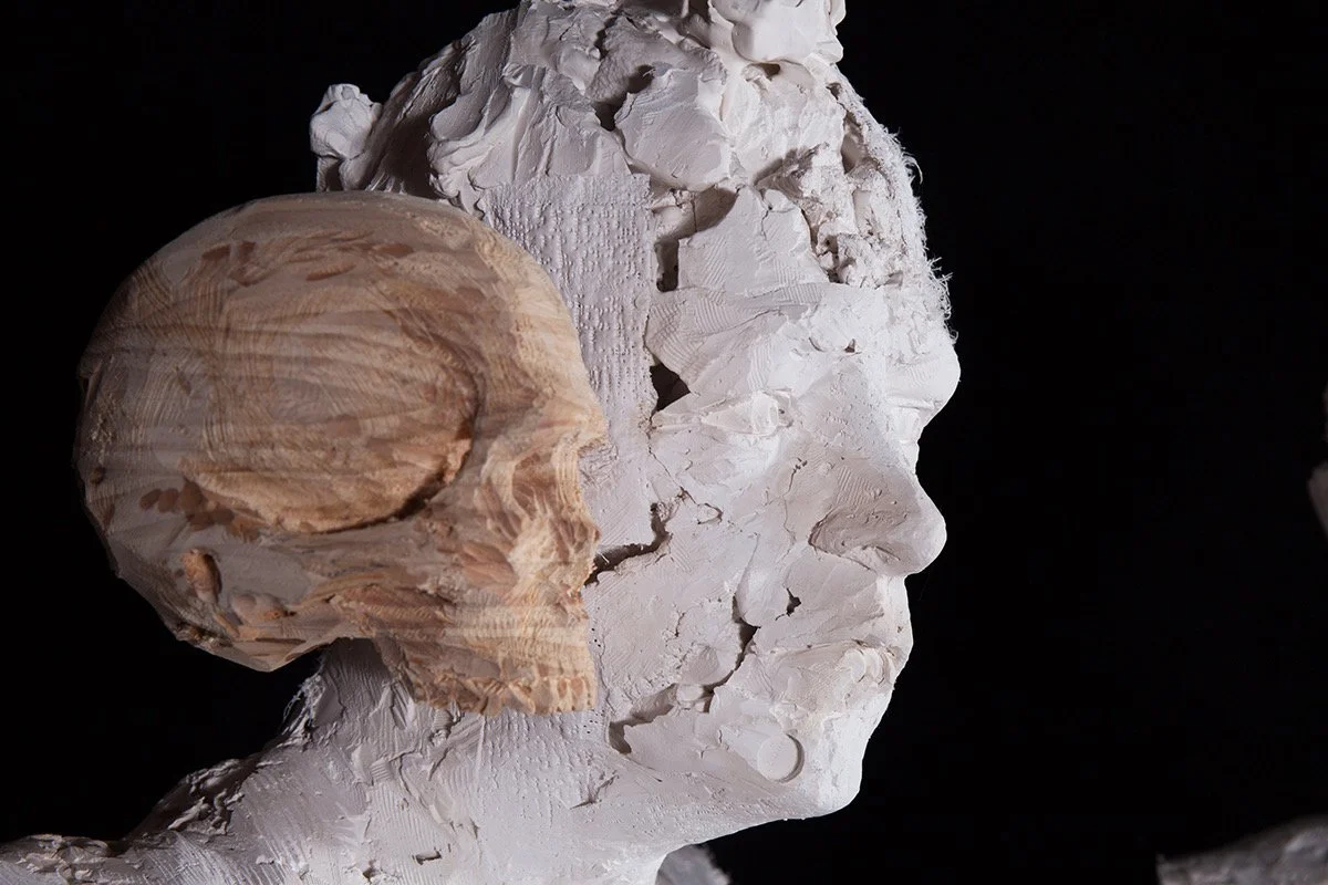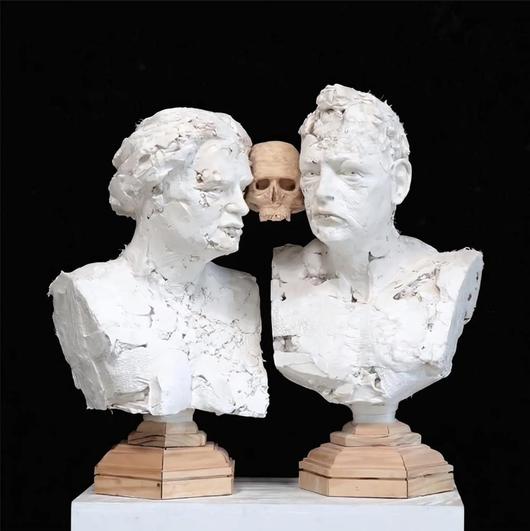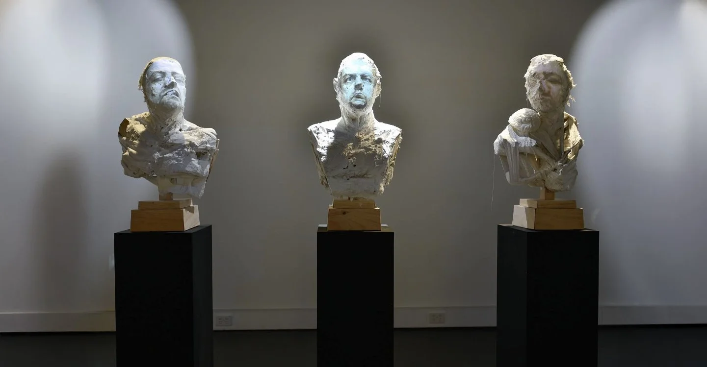 The sarcastic title frames a work of three highly textured plaster busts. Their surfaces are bound in tightly stretched bandages, fractured strands hanging loose, revealing the timber armatures beneath. These forms, part body and part construction, signify the abject within their expressions. On the far right, an almost hidden, deflated white brain rests on a shoulder, a symbol of fractured memory and psychological disjunction.