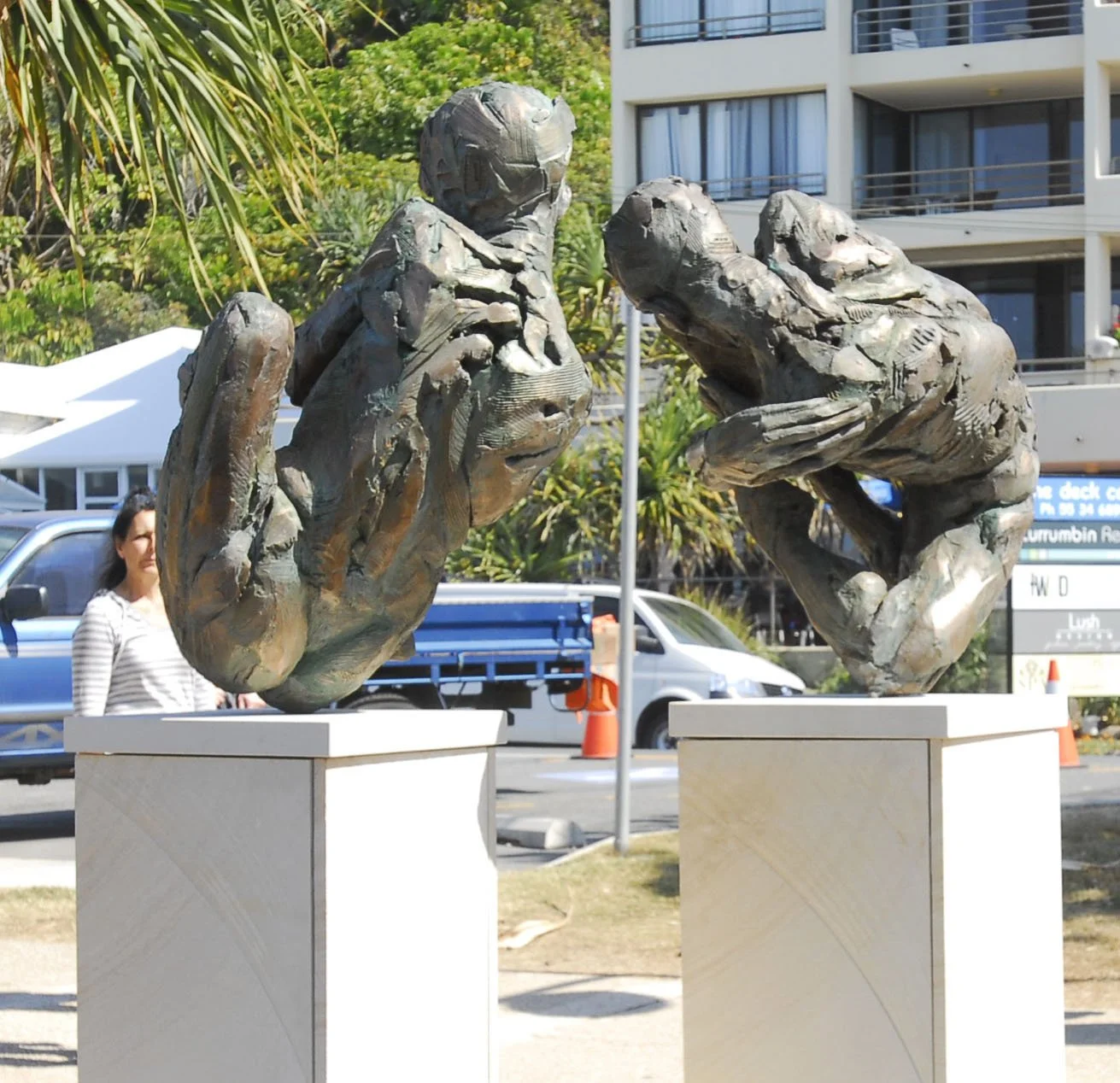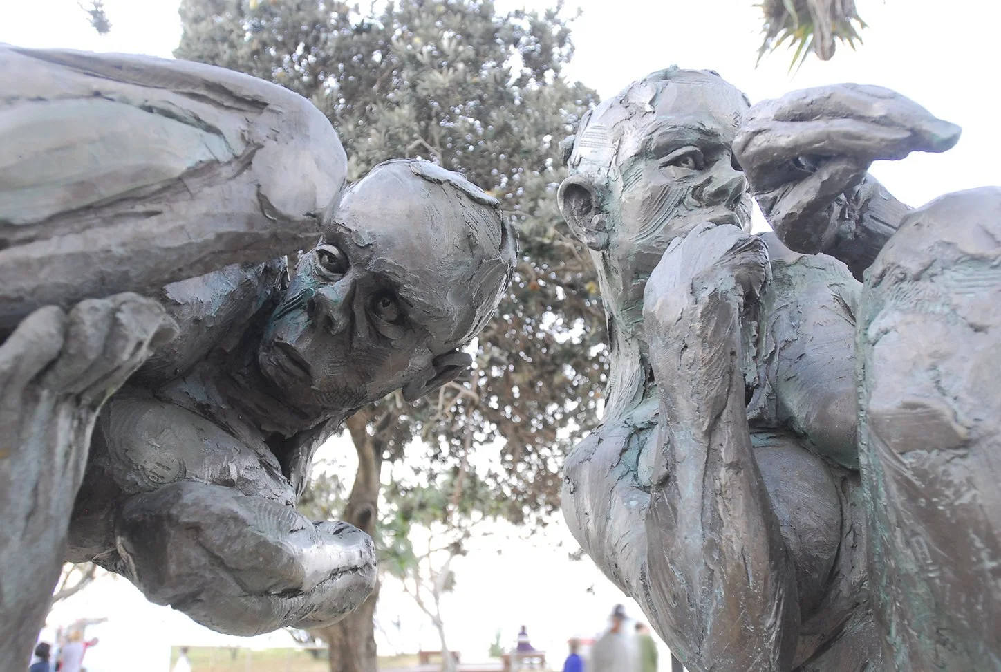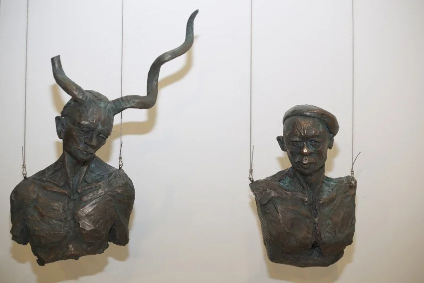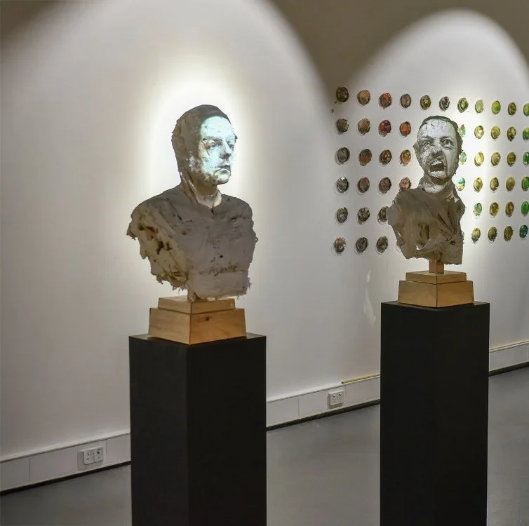 The sarcastic title frames a work of three highly textured plaster busts. Their surfaces are bound in tightly stretched bandages, fractured strands hanging loose, revealing the timber armatures beneath. These forms, part body and part construction, signify the abject within their expressions. On the far right, an almost hidden, deflated white brain rests on a shoulder, a symbol of fractured memory and psychological disjunction.