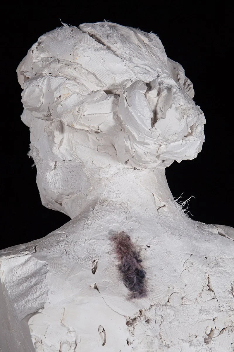 A slow-moving video projection washes over the faces of all three busts. These self-portraits recall the sculpted bust yet disrupt it: the projected image acts like a mask, unsettling the static form. In this doubling of face and bust, the work evokes Freud’s uncanny, while the moving image returns the gaze, challenging the authority of the traditional portrait.